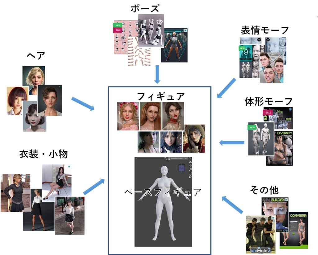 Daz Studioで何をするかによりますが、一通り遊ぼうと思うと、次のアイテムがあったほうが楽しめます。