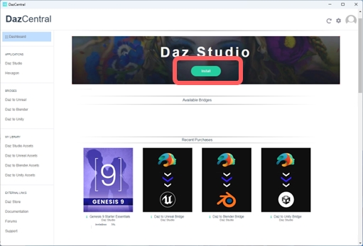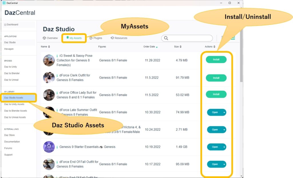 購入したアイテムは Daz Central の「My Assets」タブに表示されるので、ここから Daz Studio にインストール/アンインストールできます。