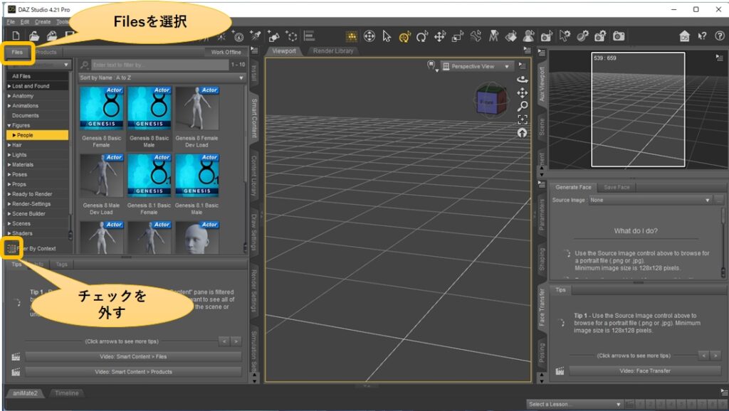 Daz Studio を起動すると、以下の画面が表示されます。まず、以下の2点を操作して下さい。