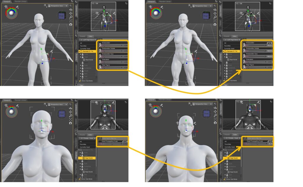 Daz Studioでは、骨格、表情、体系などを変化させることをモーフと呼んでおり、設定画面から変化させることが可能です。