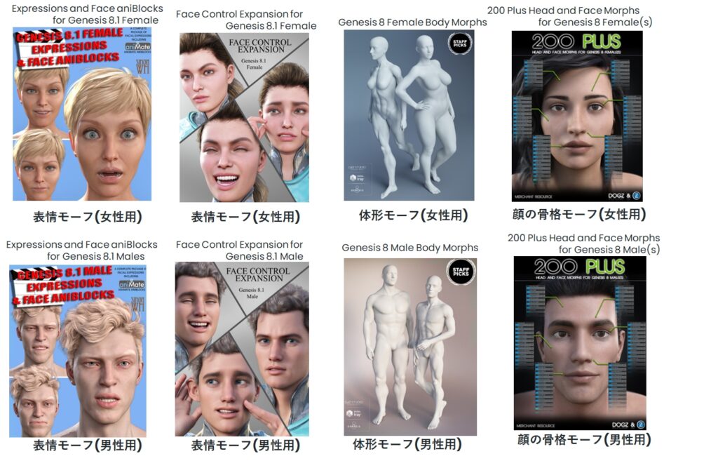 | 表情モーフ | https://www.daz3d.com/genesis-8-female-expressions https://www.daz3d.com/genesis-8-male-expressions |