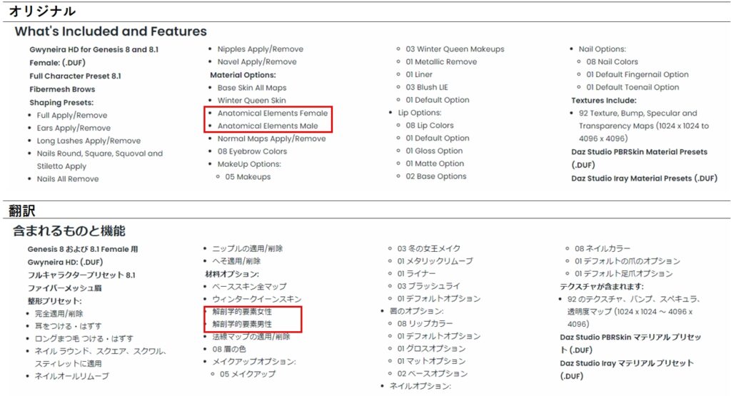 ちなみに、フィギユアには、付属品やテクスチャなどの情報が事細かに記載されています。その中に”Anatomical Elements”というキーワードがあって、日本語に翻訳すると「解剖学的要素」となります。