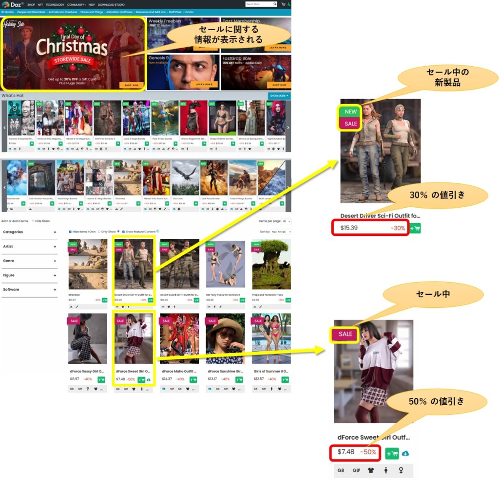 Daz3d のショップでは、常に何かのセールが開催されており、30%~60%の値引きが行われています。