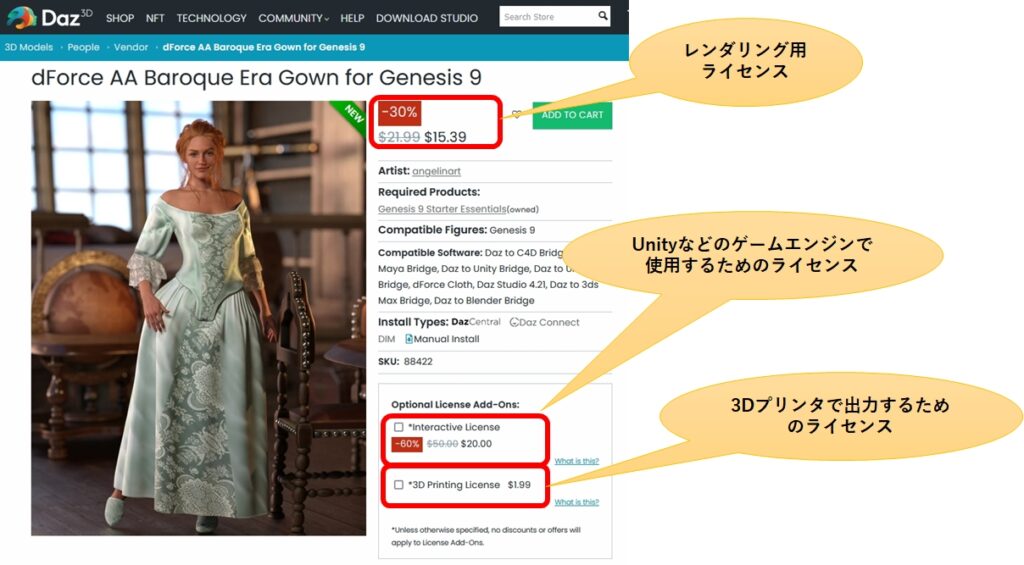 購入時の費用には、3Dモデルを画像や写真にして利用するためのライセンスが付属しています。