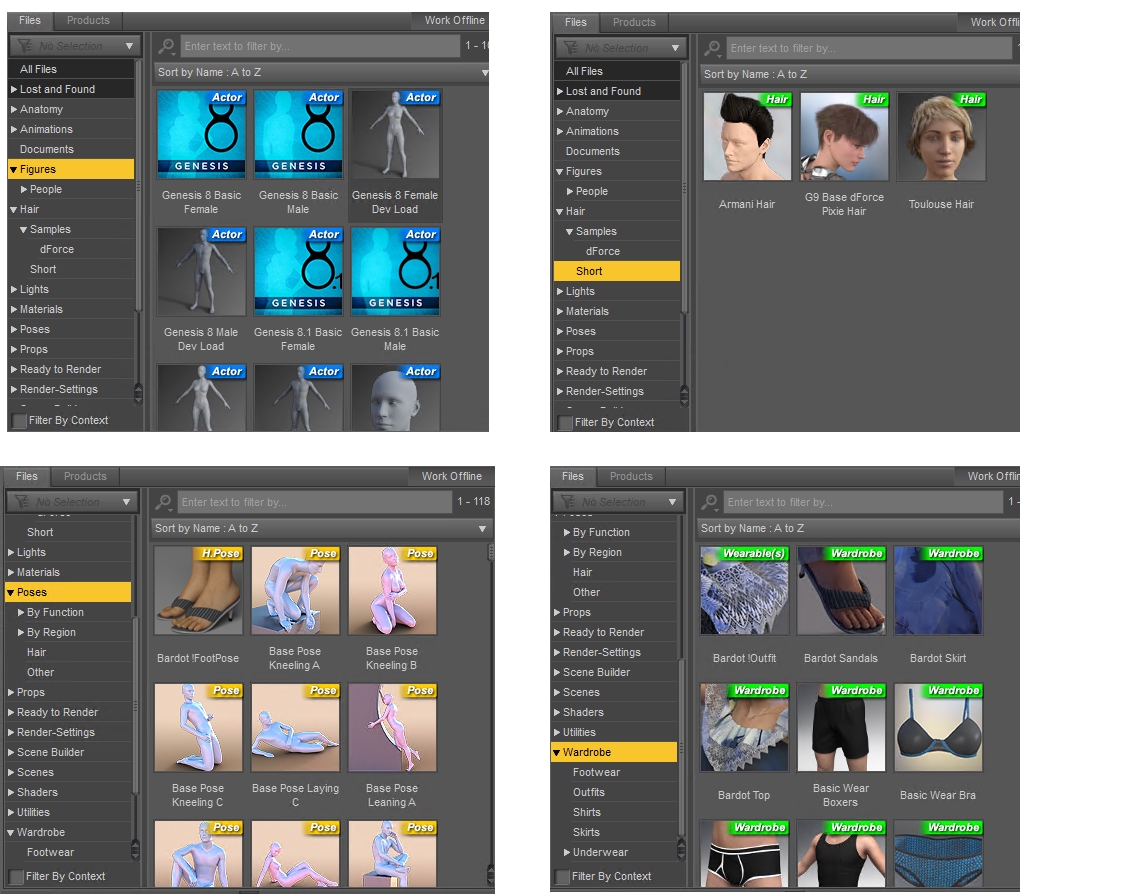 | フィギュア | “Figures Genesis 8 Female”、”Figures Genesis 8 Male” で検索しても、 ヒットしないフィギュアも多く、逆にフィギュア以外のアイテムもヒットします。 しかし、他に効率的は方法が無いので、地道に探しましょう。 “Anatomical Elements” という単語を付けて検索すると、もう少し絞れます。 |