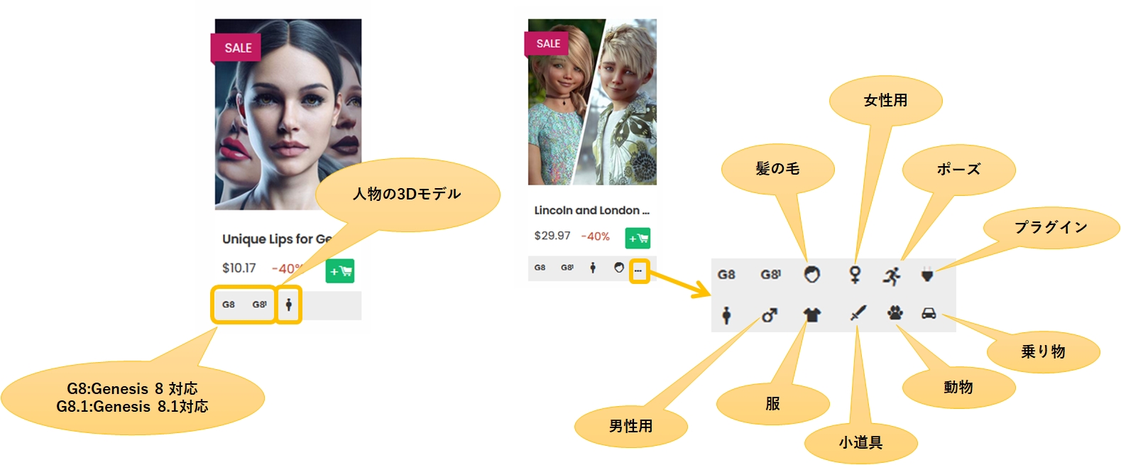 | 衣装 | 衣装については 表記のバリエーションが多く、なかなか検索しづらいですが、 “Ware Genesis 8″ 、”Dress Genesis 8” など、思いつく英語で検索するとたくさんヒットします。 |