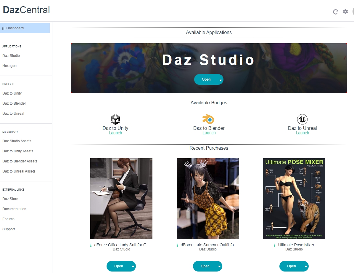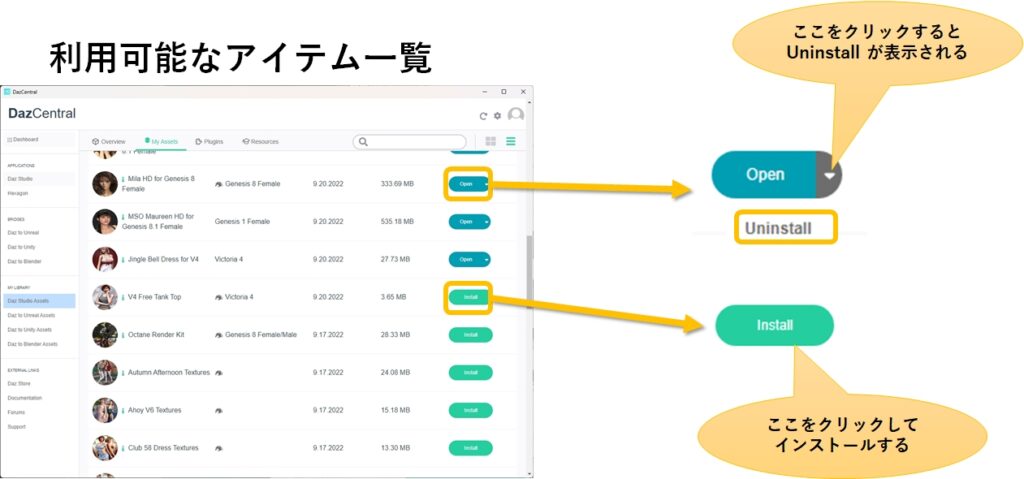 インストール済みのアイテムは「Open」と表示されていますが、どの 「Open」をクリックしても、単純に Daz Studioが起動するだけです。