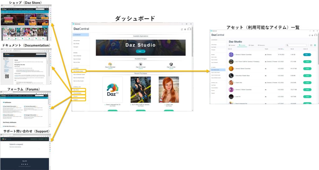アイテム購入からインストールまでの一連の操作と、Daz3d への問い合わせが1つの画面で行えるのが魅力です。