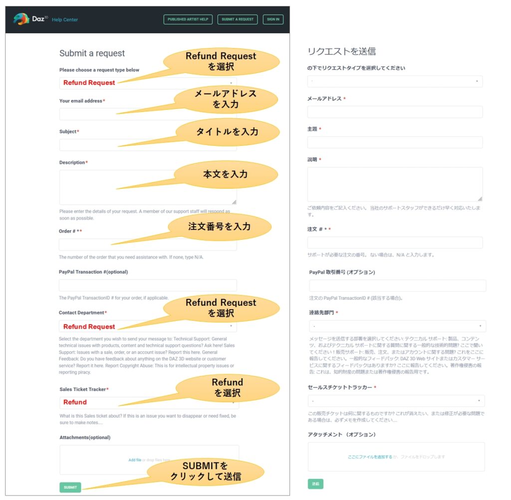後は、返金と同様にメールアドレス、タイトル、本文を入力し、最後に SUBMIT ボタンをクリックします。