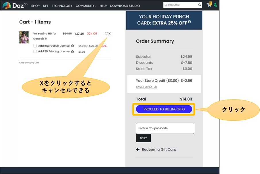 Daz+ クーポン: Daz+ クーポンは返金不可です。クーポンの適用方法については、記事「Daz+ クーポンの追加方法」を参照してください。