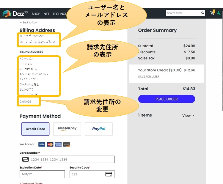 クレジットカードの場合、画面の請求先住所に表示されている名前と住所が、クレジットカード申し込み時のものと一致している必要がありますので、ご注意ください。