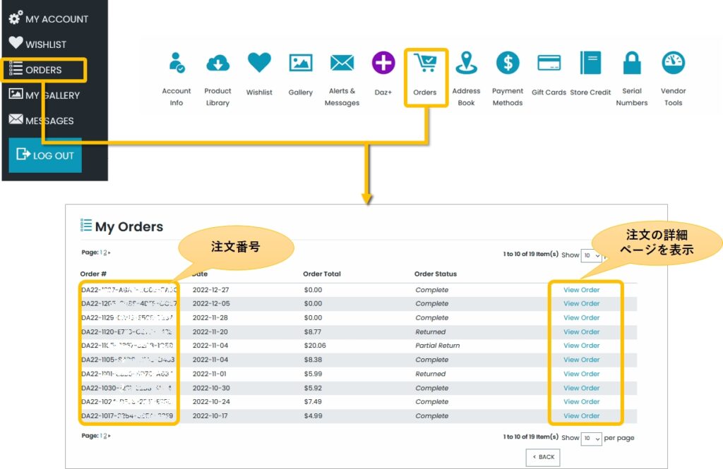 右端の「View Order」リンクで注文内容の詳細が確認できますので、返品したいアイテムの注文番号を特定して下さい。