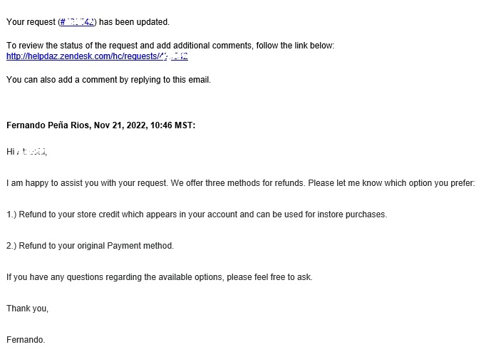 リクエスト (#XXXXX) が更新されました。 リクエストのステータスを確認し、追加のコメントを追加するには、次のリンクに従ってください。 http://helpdaz.zendesk.com/hc/requests/XXXXX このメールに返信してコメントを追加することもできます。 フェルナンド・ペーニャ・リオス、2022 年 11 月 21 日 10:46 MST: 〇〇〇さん、こんにちは。 喜んでお手伝いさせていただきます。払い戻しには3つの方法があります。 ご希望のオプションをお知らせください: 1.) アカウントに表示され、店舗での購入に使用できるストア クレジットに返金します。 2.) 元の支払い方法に返金します。 ご利用可能なオプションについてご不明な点がございましたら、お気軽にお問い合わせください。 ありがとうございました、